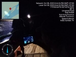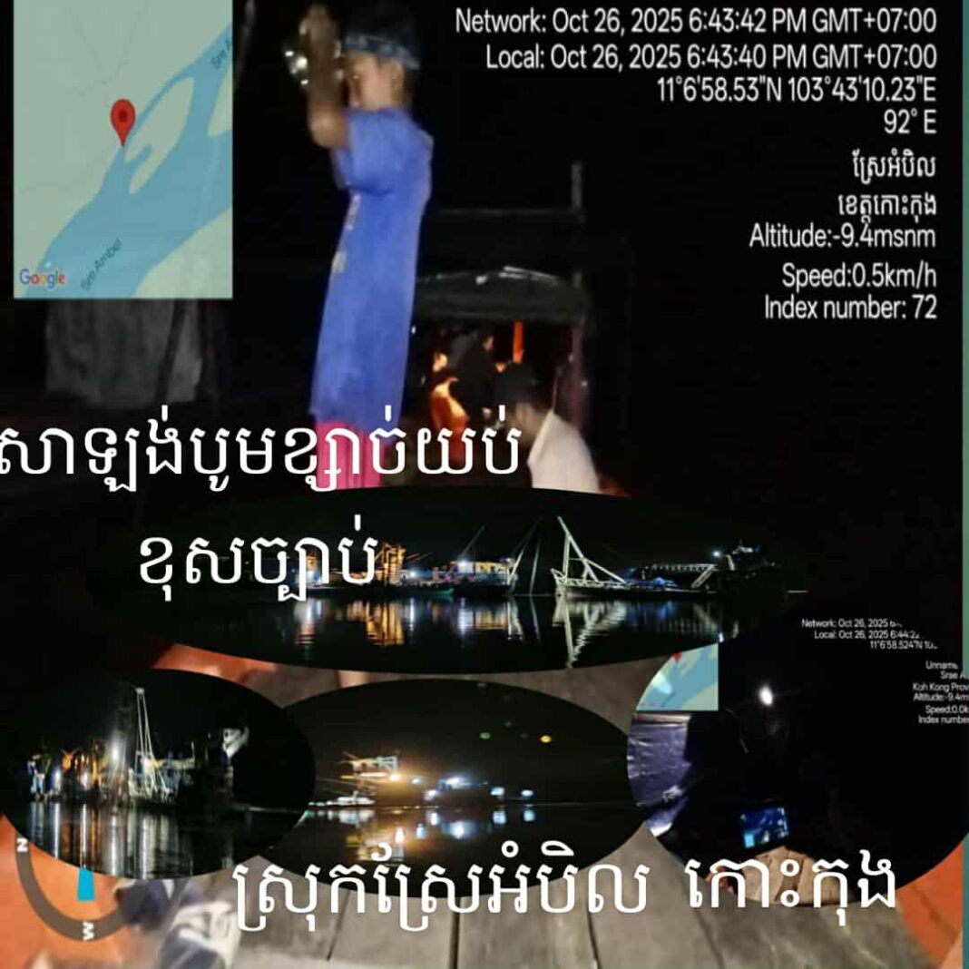 ខេត្តកោះកុង៖ ទីតាំងបូមខ្សាច់យប់ៗ ដោយសាឡង់ខ្នាតយក្សជាច្រើនគ្រឿងចូលបូមនៅសមុទ្រ ស្ថិតនៅក្នុងភូមិចំការក្រោម ឃុំដងពែង ស្រុកស្រែអំបិល ខេត្តកោះកុង ដោយខុសច្បាប់ គ្មានវិធានការពី អាជ្ញាធរនិងជំនាញចុះទប់ស្កាត់ឡើយ ។